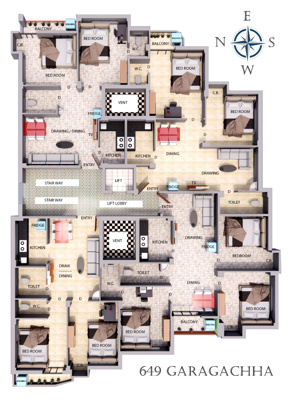 FLOORING: Total flooring will be of Vitrified Tiles. Stair & Lobby area flooring would be of marble.